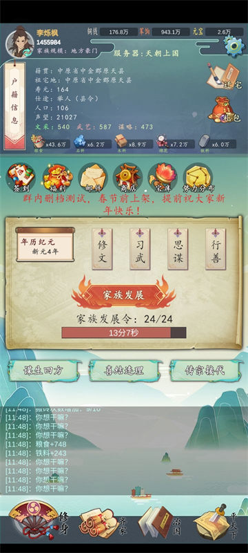 4.分工!将文采值最高的3名族人去入仕,最低20文采才有声望加成!族长不可以分工入仕,有丹药的话在家谱界面给族长或族人使用