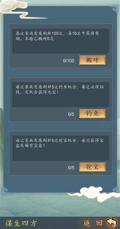 2.谋生四方,将每个玩法的奖励都拿到搬砖获得资源钓鱼获得铜钱和元宝挖宝获得宝盒类道具