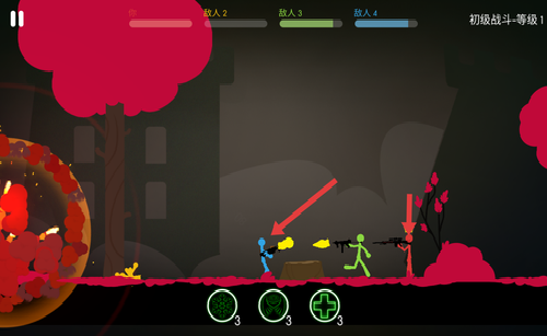 3、操控红色火柴人角色,使用手中武器对蓝色敌人发起持续攻击。